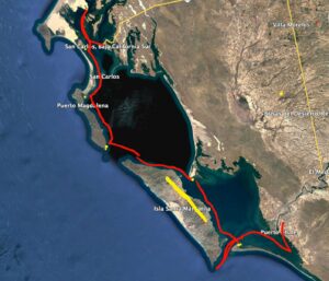 Day 1. Drive to San Carlos and enjoy a delicious lunch of locally caught seafood. Load the motorboat and the kayaks in the early afternoon. Paddle across the bay and into the beginnings of mysterious mangrove mazes. Camp at La Duna Grande “Big Dune” 6nm.